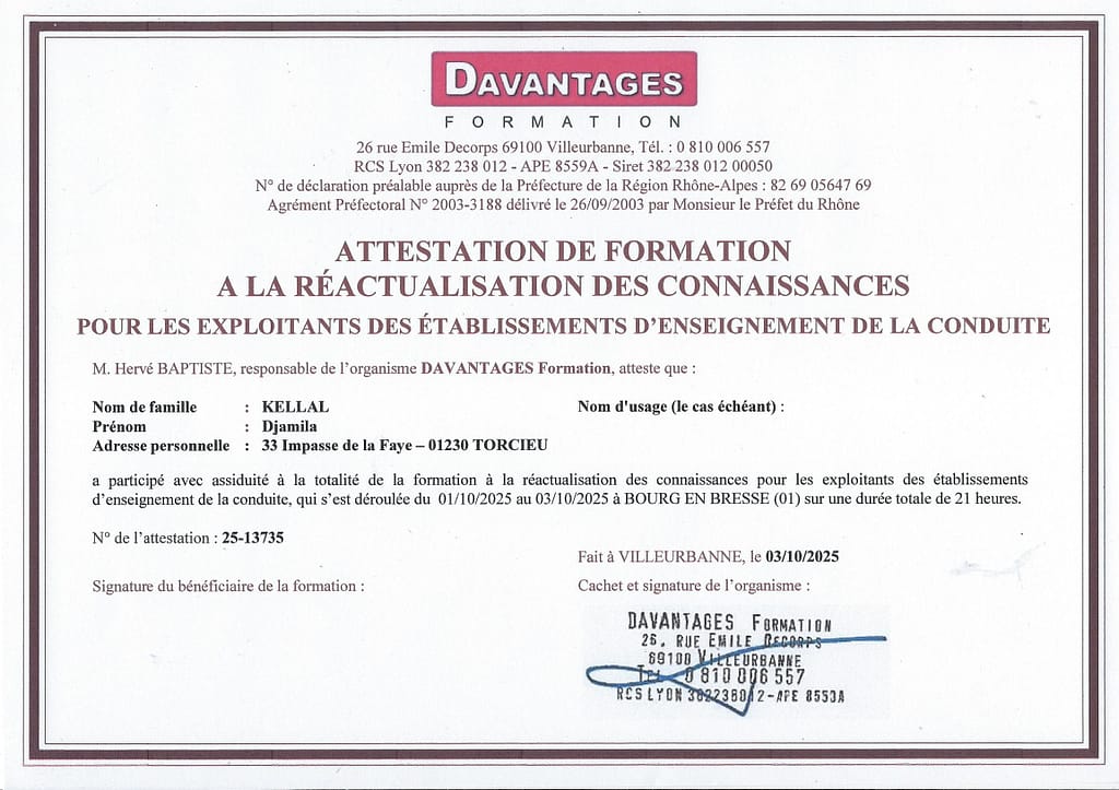 – BEPECASER (Diplôme de moniteur d’auto école) en 1981 – Installation à Saint-Rambert-en-Bugey en 1991 – Stages de réactualisation des connaissances – Audits séniors post permis avec la Prévention Routière pour la remise à niveau de la conduite des séniors – Actions de sécurité routière auprès des élèves des écoles primaires et collèges – Membre honoraire de la sécurité routière – Experte en conduite économique auprès du département